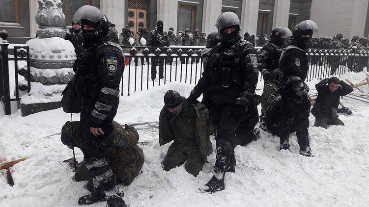 При этом полицейские действовали предельно жестко – тринадцать человек из числа майдановцев в результате избиения получили серьезные травмы. При задержании митингующих демонстративно ставили на колени, а в спецмашины их вели, заломив руки.