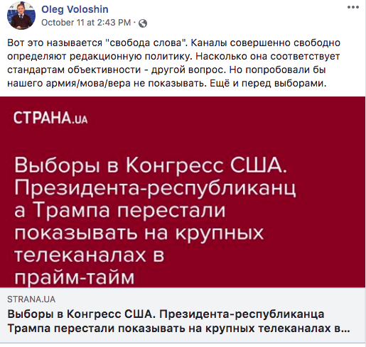 Ведущие телеканалы объявили Трампу бойкот - не показывают его в прайм-тайм. В Украине по этому поводу шутят: попробовали бы у нас не показывать Порошенко с его предвыборными тезисами "армия-вера-мова", да еще перед выборами.