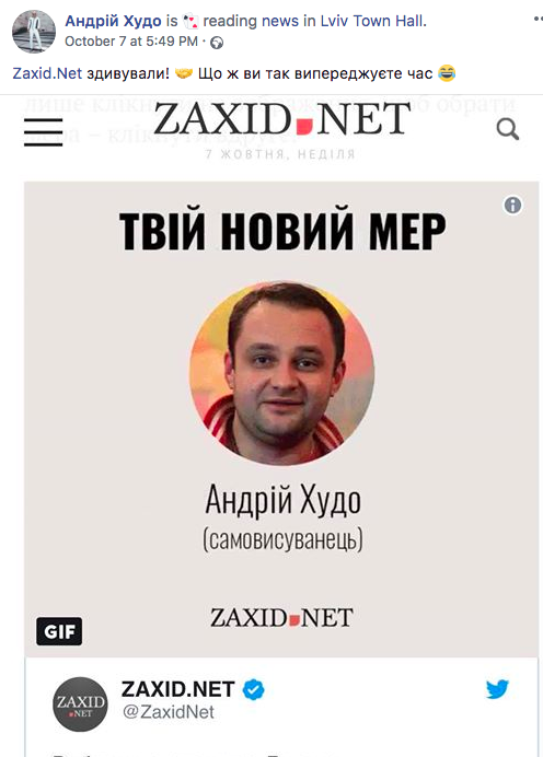 Сам Худо на своей странице в "Фейсбуке" опубликовал пост с шутливым избирательным автоматом (игру, кстати, запустил принадлежащий семье Садового сайт - нужно кликнуть по бегущим фото возможных кандидатов и выбрать мэра), где на выборах побеждает он.