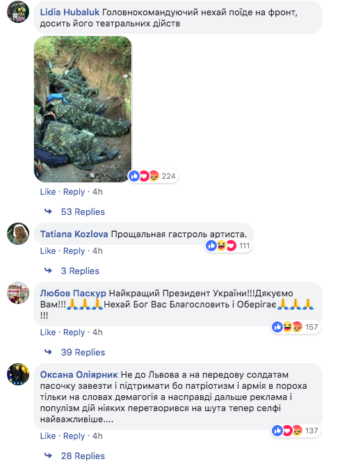 Другие возмущались: "сам же и послал их на войну, на которой зарабатывает со Свинарчуками", "показуха". И негодовали, что Порошенко зачастил во Львов, когда ему нужны голоса местных, а раньше, когда во время мусорного кризиса город утопал в грязи, не приезжал. А сейчас, мол, лучше бы поехал на передовую.