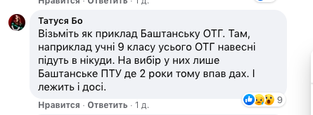 "Возьмите как пример Баштанскую ОТГ (Николаевская область, ОТГ объединяет 26 населенных пунктов, общая численность населения 22,5 тысячи человек. – Авт.) Там, например, ученики 9 класса всего ОТГ весной пойдут в никуда. На выбор у них только Баштанское ПТУ, где два года назад упала крыша. И лежит до сих пор", – ставит Стадного перед тупиковым фактом писательница и блогер Татуся Бо.