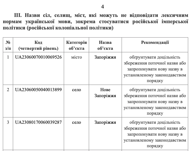 В перечень тех населенных пунктов, которые "могут не соответствовать лексическим нормам украинского языка, в частности касаться российской имперской политики", вошел областной центр Запорожской области, город Запорожье. Комиссия рекомендовала обосновать целесообразность сохранения текущего названия или предложить новое название. На это у местных властей есть шесть месяцев. Если они не сделают этого в указанный срок, название будет менять Верховная Рада по решению комиссии.