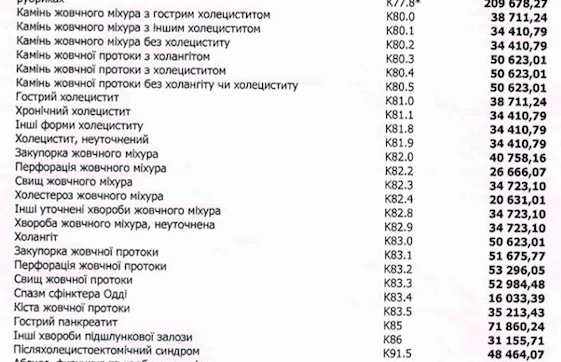 Данные по цифрам Богомолец приводит в своем блоге. Например, диагностика нарушения ритма сердца у ребенка будет стоит 65 тысяч гривен. Репротезирование двух клапанов сердца - почти 190 тысяч гривен. Аневризма сердца - почти 154 тысячи гривен. Стеноз - более 163 тысяч. Шунтирование аорты - 130 тысяч гривен. Коронарный тромбоз - 103 тысячи. Лечение цирроза печени - 111 тысяч.