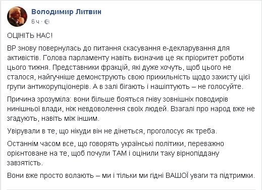 "Представители фракций, которые очень хотят, чтобы этого (отмены – Прим.Ред.) не случилось, громче других демонстрируют свою приверженность относительно защиты этой группы антикоррупционеров. А в зале бегают и нашептывают: не голосуйте. Причина понятна: они больше боятся гнева внешних поводырей нынешней власти, чем недовольства своих людей. Вообще о народе уже не вспоминают, даже между прочим. Уверовали в то, что никуда он не денется, проголосует как надо", - написал на своей странице в Фейсбуке экс-спикер, внефракционный депутат Владимир Литвин.