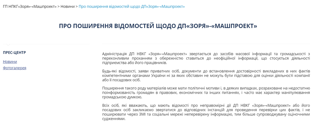 Что же касается анонсированного им заявления на сайте "Зори-Машпроекта", то никакой конкретики по поводу крымских эпизодов в карьере Картошкина на официальной странице предприятия нет. А наличествует лишь расплывчатая формулировка, где администрация оборонного предприятия призвала СМИ "с осторожностью относиться к неофициальной информации, касающейся деятельности предприятия или его работников".