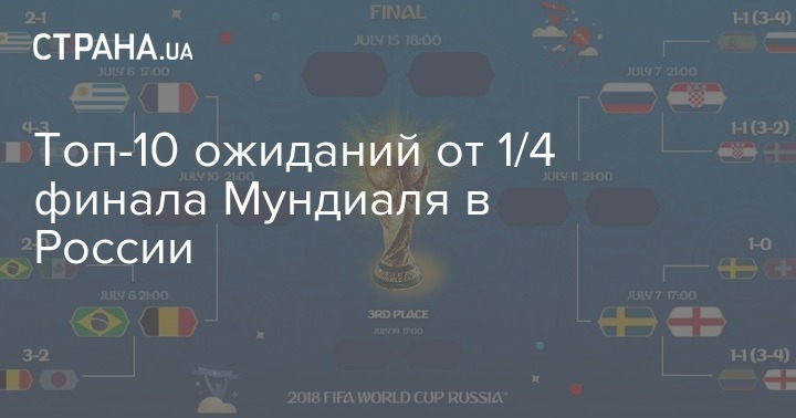 Программу четвертьфинальных матчей 6 июля начнут Уругвай - Франция (Нижний Новгород, 17:00 по киевскому времени) и Бразилия - Бельгия (Казань, 21:00 по киевскому времени). А 7 июля процесс продолжат Швеция - Англия (Самара, 17:00) и Россия - Хорватия (Сочи, 21:00).