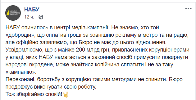 "НАБУ оказалось в центре медиакампании. Мы не знаем, кто этот "добродетель", уплативший деньги за наружную рекламу в метро и на радио, но официально заявляем, что Бюро не имеет к этому отношения. Осознаем, что из почти 200 млрд грн, присвоенных коррупционерами во власти, которые НАБУ пытается законно заставить вернуть народу украденное, может найтись копейка оплатить и не такую "кампанию", - отреагировали на странице в Facebook ведомства.
