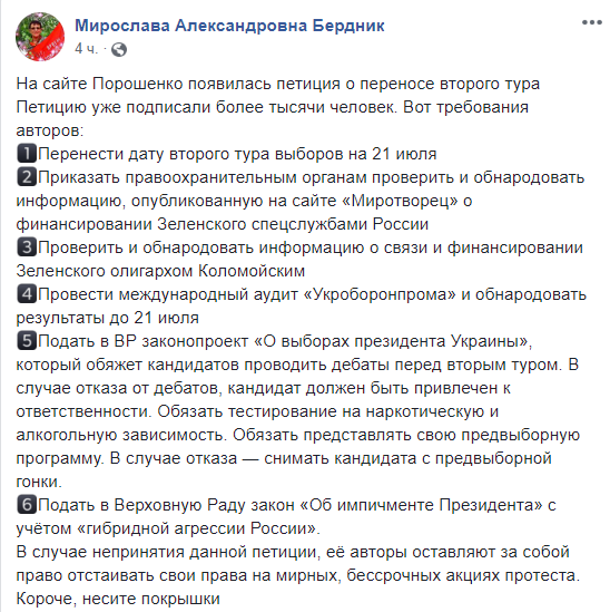Накануне второго тура выборов в социальных сетях начали появляться посты о возможном вмешательстве военных в случае избрания Зеленского президентом Украины. Один из таких постов появился на странице депутата Евгения Рыбчинского, а затем удален.