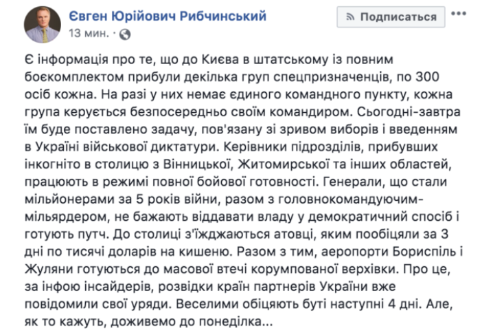 В посте, который якобы был написан нардепом и поэтом Евгением Рыбчинским, описывается, что в Киев тайно подтянуто несколько групп переодетых спецназовцев по 300 человек в каждой с полным боекомплектом. Группы действуют автономно.
