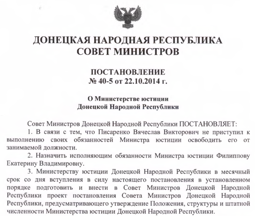 "Официальное низложение" с поста "министра юстиции" непризнанной республики произошло лишь спустя пять месяцев после информации о назначении Писаренко.