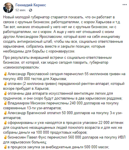 Владимир Зеленский, вы просили меня помочь – и я свою часть договора выполнил. Я собрал бизнес. 200 владельцев самых ключевых предприятий региона круглые сутки пашут над тем, чтобы найти не только дорогущие ИВЛ, но элементарные маски, костюмы, очки, перчатки, бахилы. И оплачивают их. 20 менеджеров оставили свою работу, не спят и не едят, чтобы обеспечить закупки, документооборот, логистику, коммуникации и все, что нужно Штабу.