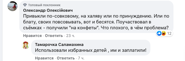 На это находятся и контраргументы: мол, хорошо, что детям хоть по 500 гривен заплатили, а не дали шоколадку и шарик. "Есть проекты, где дети снимаются и поболее и за меньшие деньги", – пишут пользователи.