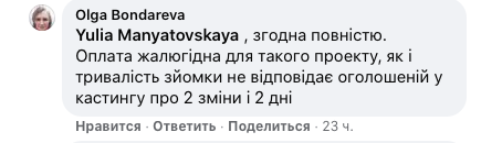Также комментаторы отмечают, что "оплата жалкая для такого проекта, как и длительность съемки не отвечает заявленной в кастинге про две смены и два дня".