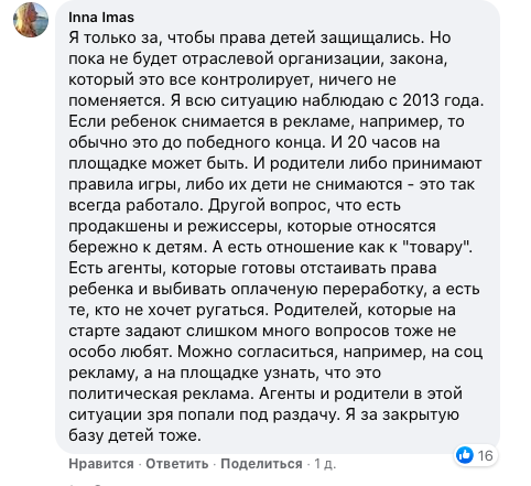 "Пока не будет отраслевой организации, закона, который это все контролирует, ничего не поменяется. Я всю ситуацию наблюдаю с 2013 года. Если ребенок снимается в рекламе, например, то обычно это до победного конца. И 20 часов на площадке может быть. И родители либо принимают правила игры, либо их дети не снимаются – это так всегда работало. Другой вопрос, что есть продакшены и режиссеры, которые относятся бережно к детям. А есть отношение как к "товару". Есть агенты, которые готовы отстаивать права ребенка и выбивать оплаченную переработку, а есть те, кто не хочет ругаться. Родителей, которые на старте задают слишком много вопросов, тоже не особо любят. Можно согласиться, например, на соцрекламу, а на площадке узнать, что это политическая реклама. Агенты и родители в этой ситуации зря попали под раздачу", – пишет Inna Imas.