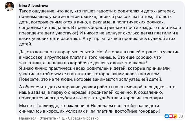 "Дети снимались, заработали гонорар, родители были рядом, никого насильно не тянули. Что не так? В рекламе снимают намного чаще и больше детей каждый день. Что вам не так?" – пишет одна из пользовательниц.