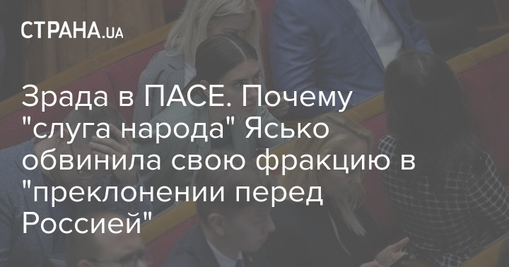 Рокировка в руководстве постоянной делегации Верховной Рады в Парламентской ассамблее Совета Европы (ПАСЕ) произошла со скандалом. Член фракции "Слуги народа" Елизавета Ясько лишилась руководящей должности по воле коллег по фракции, состоящих в делегации, за что она публично обвинила их в коррупции, "девальвации совести" и "преклонением перед повесткой дня страны-агрессора", то есть России.