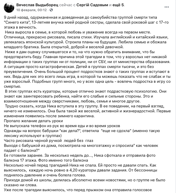 "Трудно сказать, когда Ника вступила в эту группу. В ее поведении, на первый взгляд, ничего не изменилось. Она была такой же веселой, активной и жизнерадостной. Первые изменения появились после зимнего карантина. Пропало желание делать уроки. Не выпускала телефон из рук во время еды и во время уроков. Однажды на вопрос бабушки "как дела?", ответила "еще не сдохла" (именно такую лексику используют в группах). Часто рисовала черной ручкой людей без глаз. Выходя с бабушкой из дома, посмотрела на многоэтажку и спросила "как человек падает с балкона?" Ее готовили заранее. За несколько недель до..., Ника сфоткала и отправила фото балкона 17 этажа. Фото именно того балкона", - заявляет Вячеслав Выдыборец.