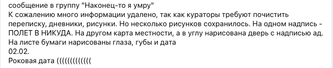 "К сожалению, много информации удалено, так как кураторы требуют почистить переписку, дневники, рисунки. Но несколько рисунков сохранилось. На одном надпись - ПОЛЕТ В НИКУДА. На другом карта местности, а в углу нарисована дверь с надписью ад. На листе бумаги нарисованы глаза, губы и дата 02.02. Роковая дата", - написал Вячеслав Выдыборец.