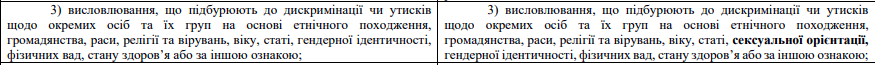 Одна из новаций проекта - появление запрета на высказывания, которые дискриминируют по факту сексуальной ориентации.