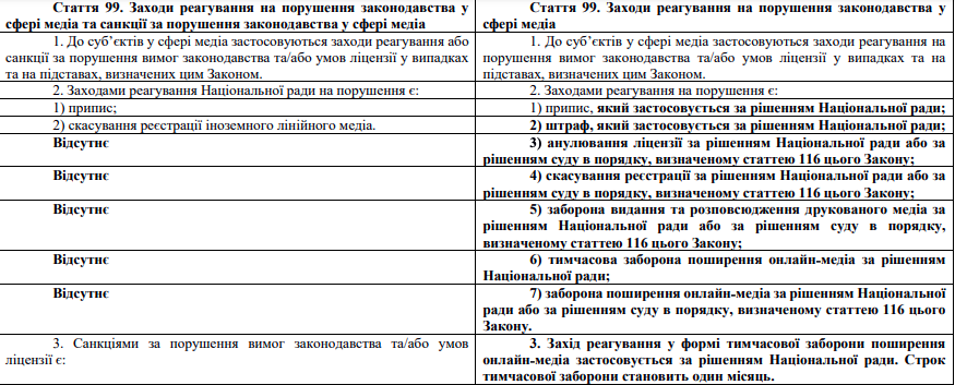 При этом у Нацсовета остаются широкие возможности заблокировать любые медиа. Так, Нацсовет может применить в отношении медиа штрафы, аннулировать лицензии по решению суда или по собственному решению, отменить регистрацию, запретить издание или распространение печатного медиа, временно запретить распространение онлайн-медиа, или запретить онлайн-медиа в целом по решению суда или без него.