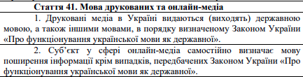 Что касается онлайн-медиа, то звучит такая фраза "субъект в сфере онлайн-медиа самостоятельно определяет язык распространения информации, кроме случаев, предусмотренных законом "О функционировании украинского языка как государственного".
