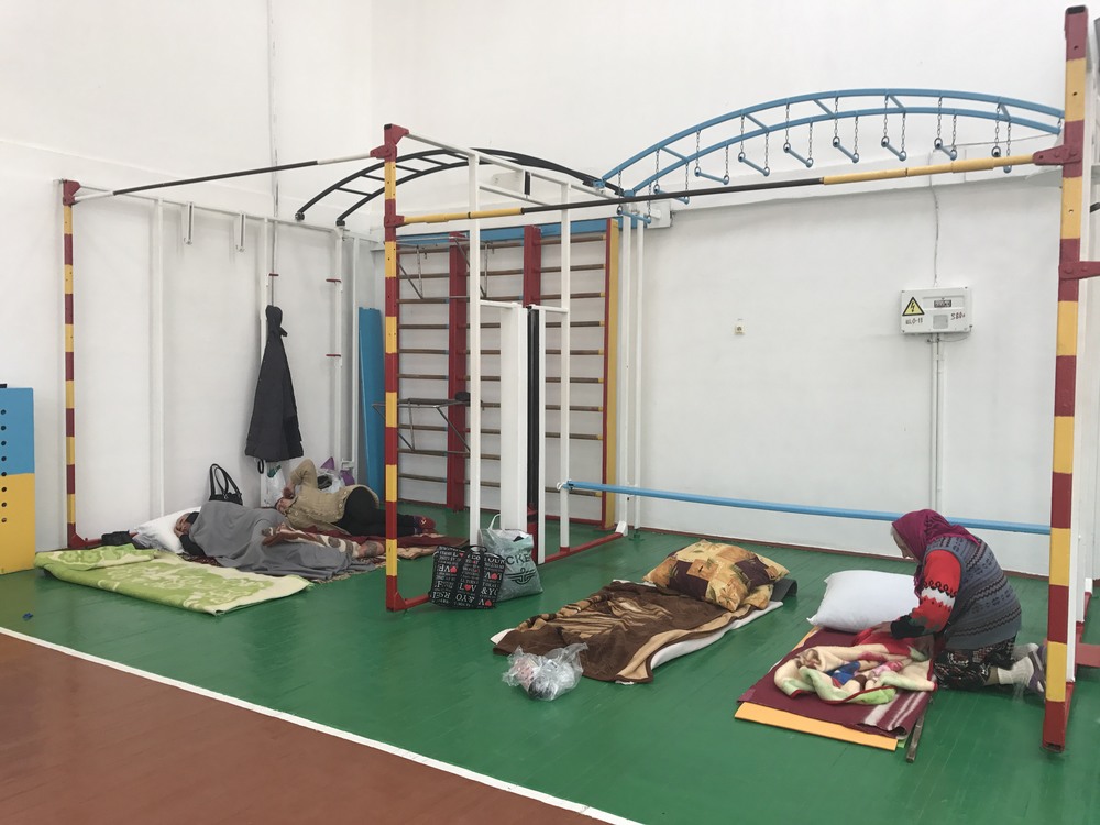 На втором этаже школы находится спортзал. Вдоль периметра, по которому обычно школьники сдают кросс, лежат постели из гимнастических ковриков и пледов. Под стенкой сложены вещи, которые волонтеры и обычные винничане приносят для пострадавших.