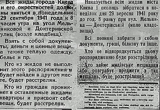 В сентябре 1941 года немцы арестовалы девять главных киевских раввинов, приказав объявить общине: "После санобработки все евреи и их дети, как элитная нация, будут отправлены в безопасные места…". 28 сентября по всему городу были расклеены объявления, чтобы 29 сентября все евреи к 8 часам утра собрались на углу Мельниковой и Доктеривской с документами и ценными вещами, в случае неповиновения – расстрел.