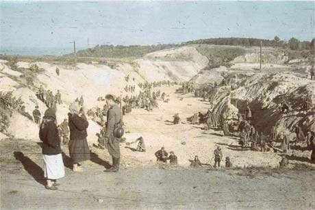 Из свидетельских показаний шофера Вермахта: "Раздетых евреев направляли в овраг примерно 150 метров длиной, 30 метров шириной и целых 15 метров глубиной. В этот овраг вело 2 или 3 узких прохода, по которым спускались евреи. Когда они подходили к краю оврага, немецкие полицейские хватали их и укладывали на трупы уже находившихся там расстрелянных евреев. Это происходило очень быстро. Трупы лежали аккуратными рядами. Как только еврей ложился, подходил полицейский с автоматом и стрелял лежавшему в затылок. Евреи, спускавшиеся в овраг, были настолько испуганы этой страшной картиной, что становились совершенно безвольными. Из города прибывали все новые массы людей и они, по-видимому, ничего не подозревали, полагая, что их просто переселяют".