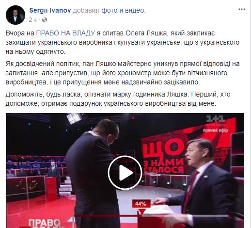 "Как опытный политик, г-н Ляшко мастерски ушел от ответа на вопрос, но предположил, что его хронометр может быть отечественного производства, и это предположение меня чрезвычайно заинтересновала. Помогите, пожалуйста, опознать часы. Первый, кто поможет, получит подарок украинского производства от меня", - написал Иванов в своем посте.