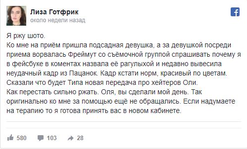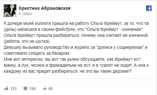 "К дочери моей коллеги пришла на работу Ольга Фреймут, за то, что та (дочь) написала в своем фейсбуке, что "Ольга Фреймут – конченая". Ольга Фреймут пришла разбираться, почему она считает ее конченой (ребята, это не шутка). Девушку вызывало руководство и журило за "дописи у соцмережах" и советовало следить за базаром. Мне вот интересно, вы вот так рьяно обсуждаете, как Фреймут ест манку, а лук, чеснок и фрикадельки не ест, и в туалет не ходит. А она к каждому из вас придет разбираться, че это вы такие дерзкие?", – написала она.