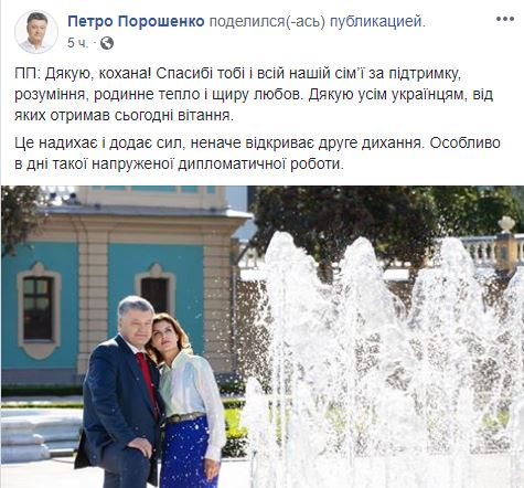 "ПП: Спасибо, любимая! Спасибо тебе и всей нашей семье за поддержку, понимание, семейное тепло и искреннюю любовь. Спасибо всем украинцам, от которых получил сегодня поздравления. Это вдохновляет и придает сил, как будто открывает второе дыхание. Особенно в дни такой напряженной дипломатической работы", – ответил Порошенко.