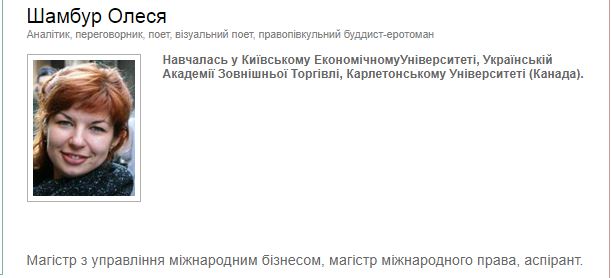 А еще мы нашли профиль супруги экс-советника министра внутренних дел на литературном сайте "Буквоїд". Там указано, что Олеся Шамбур - аналитик, переговорщик, поэт, визуальный поэт и правополушарный буддист-эротоман. Также отмечается, что образование она получала в трех учебных заведениях: Киевском национальном экономическом университете, Украинской академии внешней торговли и Карлетонском университете (Канада).