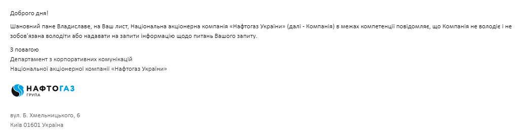 Однако мы получили очень уклончивый ответ: "НАК "Нафтогаз Украины" в рамках компетенции сообщает, что Компания не владеет и не обязана владеть или предоставлять на запросы информацию, касательно вопросов в вашем запросе".