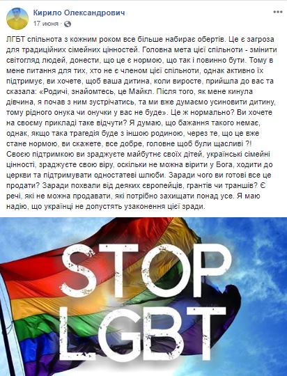 "ЛГБТ-сообщество с каждым годом набирает обороты. Это угроза для традиционных семейных ценностей. Главная цель этого сообщества - изменить мировоззрение людей, донести, что это является нормой, так и должно быть", - пишет Кирилл Турчинов.