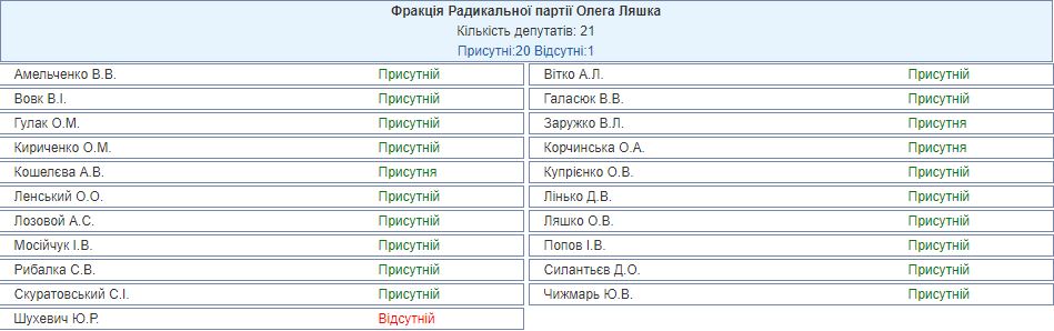 В это же время на сайте Верховной Рады значится, что вся фракция "Радикальной партии Олега Ляшко" практически в полном составе работает в поте лица и за этот день им начислится заработная плата. Отсутствует лишь один депутат и это Юрий Шухевич.