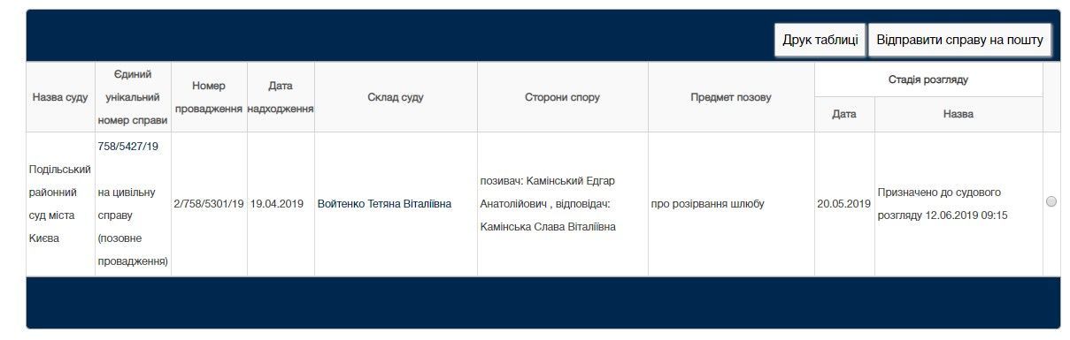 Как стало известно, бракоразводный процесс назначен на 12 июня 2019 года и состоится в Подольском районном суде города Киева. Судья - Татьяна Войтенко.
