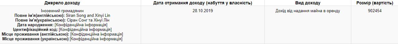 Согласно уточнению, 28 октября Зе получил 902 454 грн от сдачи имущества в аренду иностранным гражданам с именами Сиран Сонг и Хинуи Лин. В то же время, в электронной декларации не указано, что именно сдавал президент в аренду за такую сумму.