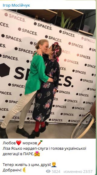 Игорь Мосийчук, экс-депутат от "Радикальной партии" в своем личном Telegram-канале выложил фотографию с двумя целующимися девушками и заявил, что одна из них 29-летняя нардеп Елизавета Ясько (прошла в парламент под №15 в списке партии "Слуга народа"), глава украинской делегации в Парламентской ассамблее Совета Европы (ПАСЕ). "Теперь живите с этим, друзья!" – написал он.