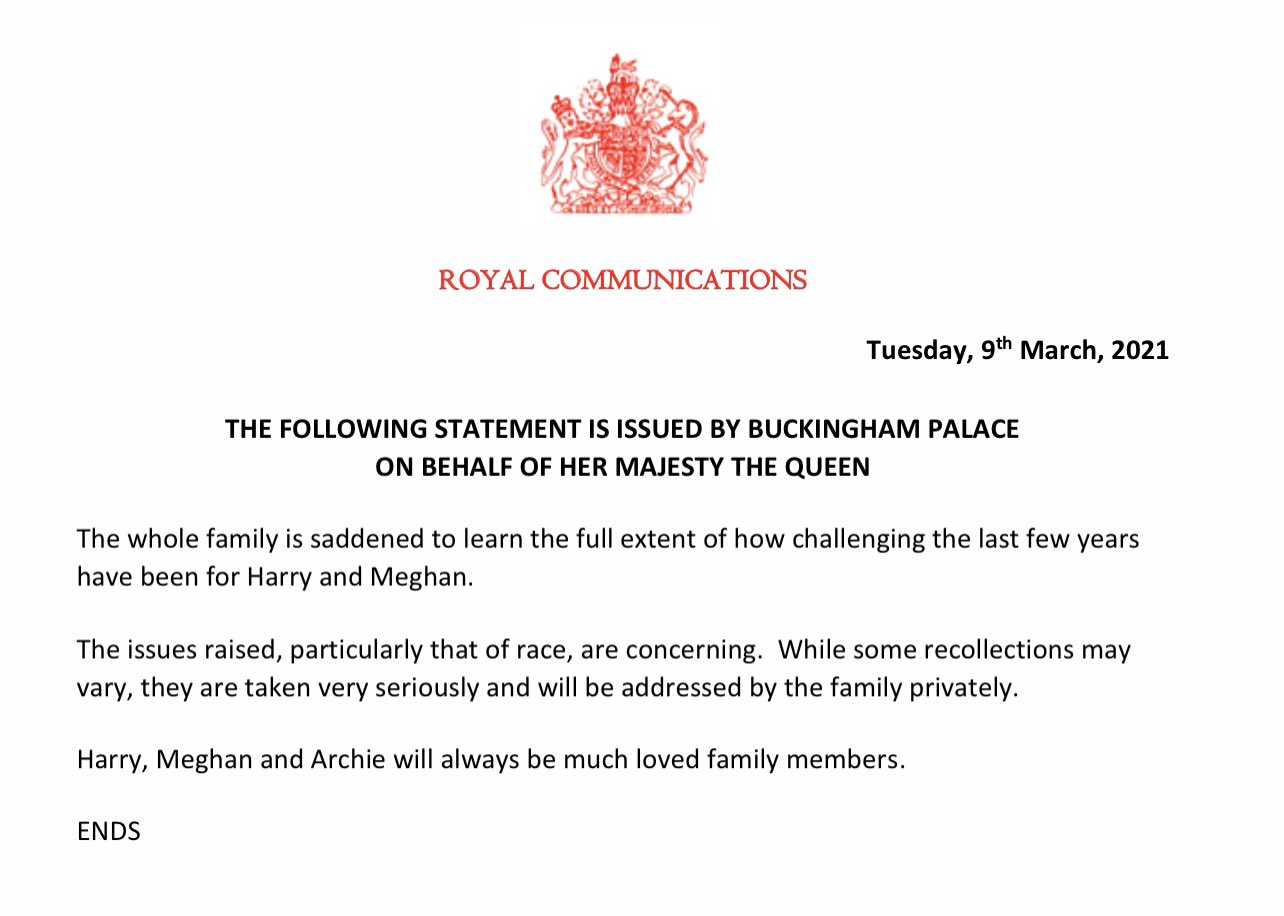 Букингемский дворец от имени Елизаветы II уже успел обнародовать заявление: "Вся семья опечалена, узнав, насколько сложными были последние несколько лет для Гарри и Меган. Поднятые вопросы, особенно расовые, вызывают беспокойство. Хотя некоторые воспоминания могут отличаться, они воспринимаются очень серьезно и будут рассмотрены семьей в частном порядке. Гарри, Меган и Арчи всегда будут любимыми членами семьи".