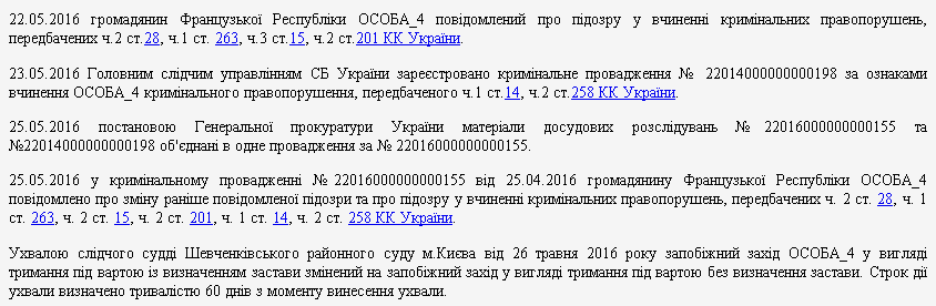 Еще через два дня, 25 мая 2016 года, "террористическое" уголовное производство присоединили к "основному" - по перевозке и контрабанде оружия. И сразу же Грегуару Муто предъявили измененное подозрение, где фигурировали все три статьи УК. Об этом говорится в определении Шевченковского райсуда столицы: