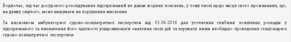 "во время досудебного расследования подозреваемый не давал никаких объяснений, в том числе о месте своего проживания, что, по мнению следователя, может указывать на нарушения мышления".