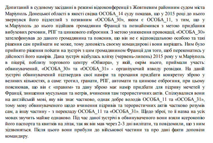 Встреча состоялась летом (июнь-июль) 2015 года в Мариуполе в пиццерии, вблизи торгового центра "Обжора". В ней, кроме свидетеля - командира роты разведки "Азова", принимали участие Муто, сам Зубов и командир взвода разведки. На данной встрече Муто подтвердил свою просьбу приобрести конкретную оружие в больших количествах, а именно: тротил, гранаты, РПГ, автоматы и цинковое вооружение. При этом объяснял, что он является "правым" и данное оружие намерен приобрести для подрыва мечетей в Франции, уничтожение мусульман и африканцев.