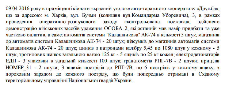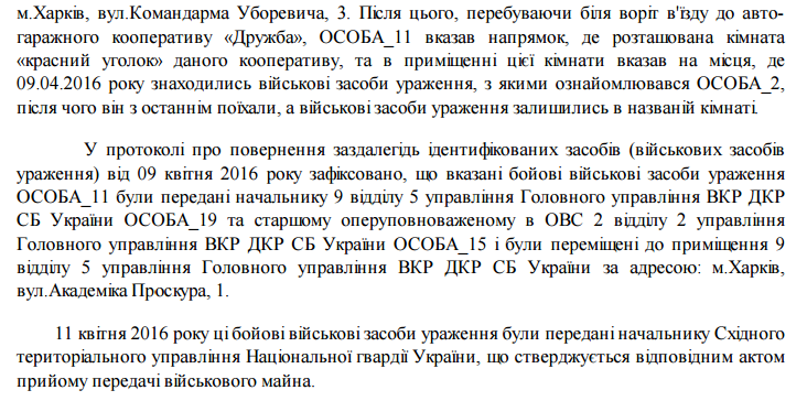 После демонстрации оружие, боеприпасы и взрывчатка были вывезены с территории гаражного кооператива и переданы сотрудникам военной контрразведки и перемещены в помещение Главного управления военной контрразведки СБУ по адресу: г. Харьков, ул. Академика Проскуры, 1. 11 апреля 2016 года эти боевые средства были переданы начальнику Восточного территориального управления Национальной гвардии Украины, что подтверждается соответствующим актом приема передачи военного имущества: