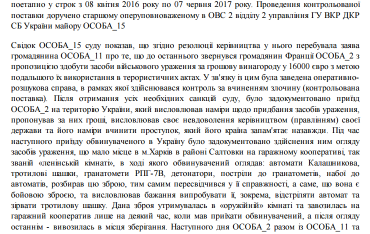 Француз не знал, что вместо настоящих автоматов, гранатометов и взрывчатки ему подсунули муляжи. Как сообщается в приговоре, сотрудники СБУ на этот раз завезли в гаражный кооператив на Салтовке ненастоящие (имитационные) спецсредства - демилитаризированные автоматы и гранатометы, учебные патроны и детонаторы, а также муляжи тротиловых шашек: