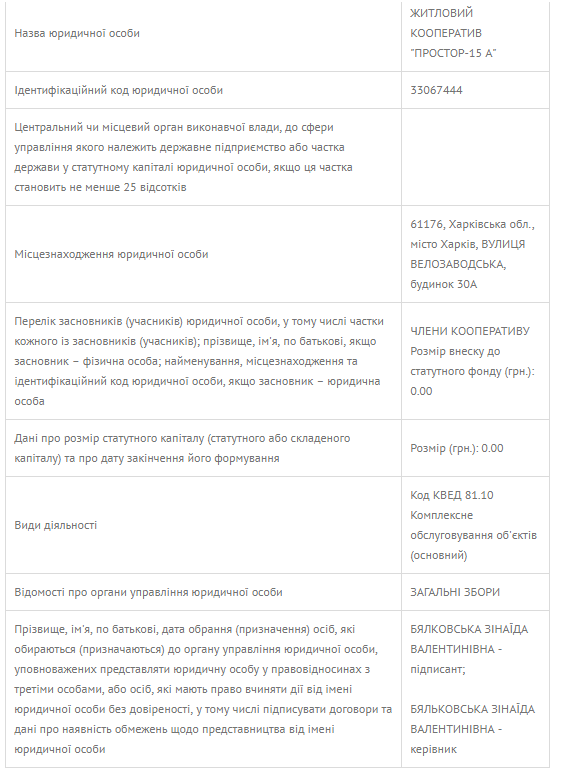 Согласно данным единого реестра юридических лиц, Зинаида Бяльковская возглавляет жилищный кооператив "Простор-15 А", который управляет многоквартирным жилым домом по ул. Велозаводской, 30-А в Харькове: