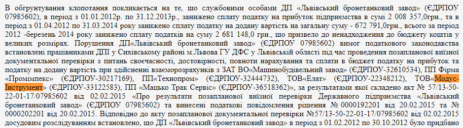 ООО "Модус-Инструмент" засветилось также на операциях со "Львовским бронетанковым заводом". Фирма проходила по уголовному производству № 32015140000000047 от 06.03.2015 г., которое расследовали львовские налоговики. Должностных лиц завода подозревали в совершении уголовного преступления, предусмотренного ч.2 ст.212 УК Украина, а именно – уклонении от уплаты налогов в крупных размерах.