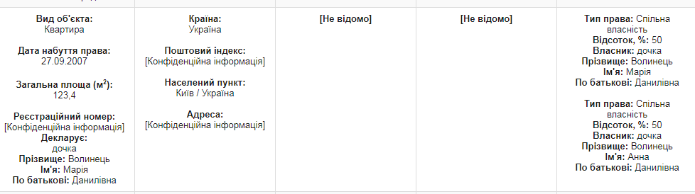 Раньше на дочек Волынца и Маркаровой Анну и Марию была также записана приобретенная в 2007 году 123-метровая квартира в Киеве. Ее Оксана Маркарова задекларировала в 2017 году: