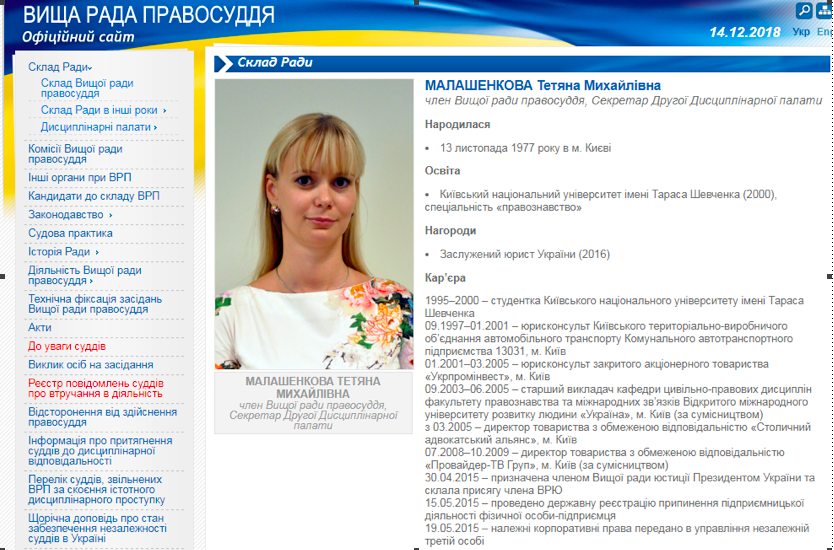 Как сказано в официальной биографии на сайте ВСП, Татьяна Малашенкова с 2001 по 2005 годы работала юрисконсультом закрытого акционерного общества "Укрпроминвест". До создания корпорации "Рошен" это была ключевая структура бизнес-империи Петра Порошенко: