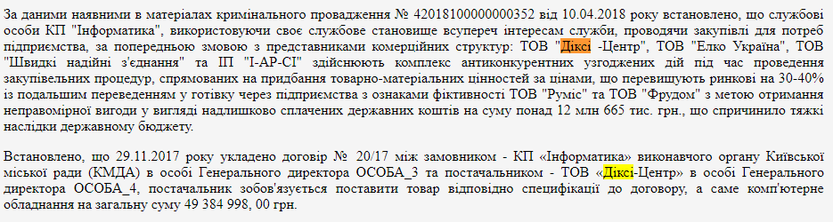 "Дикси-центр" является фигурантом уголовного производства, в котором полиция расследует закупки компьютерного оборудования коммунальным предприятием "Информатика", которое подчиняется киевской мэрии.