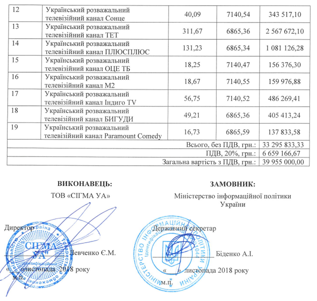 Согласно условиям опубликованного договора, из полученных 19,4 миллиона рекламисты потратили 4,7 млн грн на свой "родной" телеканал "Украина". Это наибольшая часть из полученных денег, другие телеканалы получили в разы меньше: